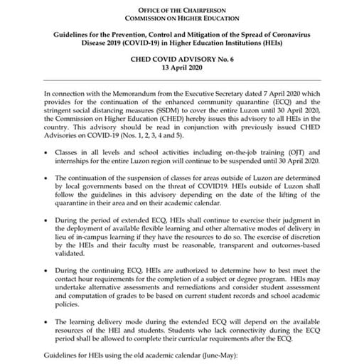 In connection with the Memorandum from the Executive Secretary dated 7 April 2020 which provides for the continuation of the enhanced community quarantine (ECQ) and the stringent social distancing measures (SSDM) to cover the entire Luzon until 30 April 2020, the Commission on Higher Education (CHED) hereby issues this advisory to all HEIs in the country. This advisory should be read in conjunction with the previously issued CHED Advisories on COVID-19 (Nos. 1-5).